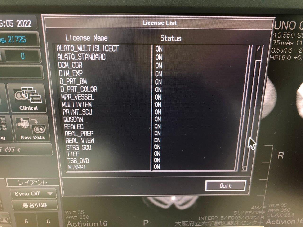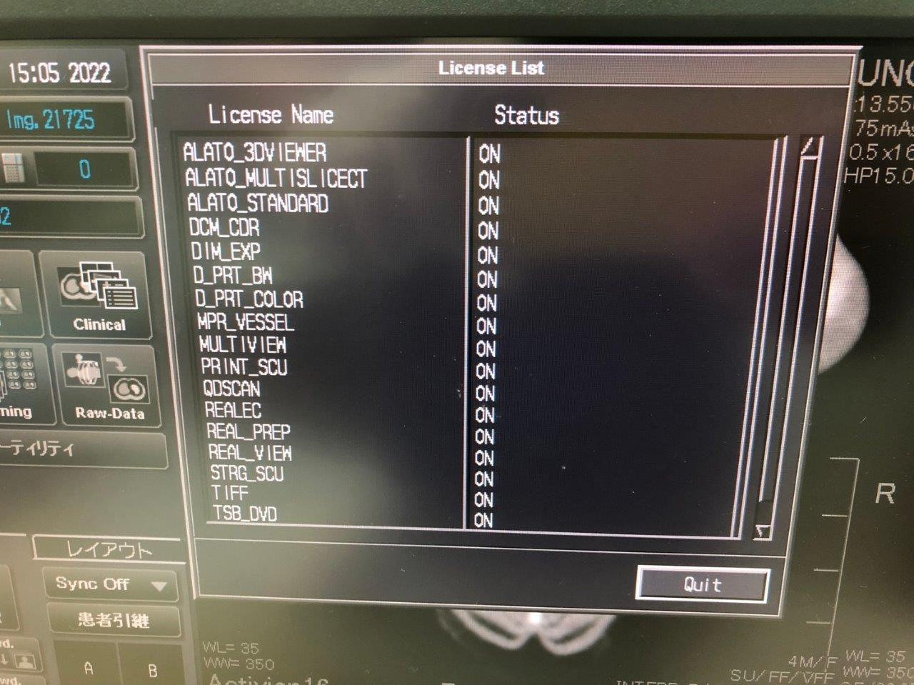 Installed options: ALATO_3DVIEWER, ALATO_MULTISLICECT, ALATO_STANDARD, DCM_CDR, DIM_EXP, D_PRT_BW, D_PRT_COLOR, MPR_VESSEL, MULTIVIEW, PRINT_SCU, QDSCAN, REALEC, REAL_PREP, REAL_VIEW, STRG_SCU, TIFF, TSB_DVD, WINPRT