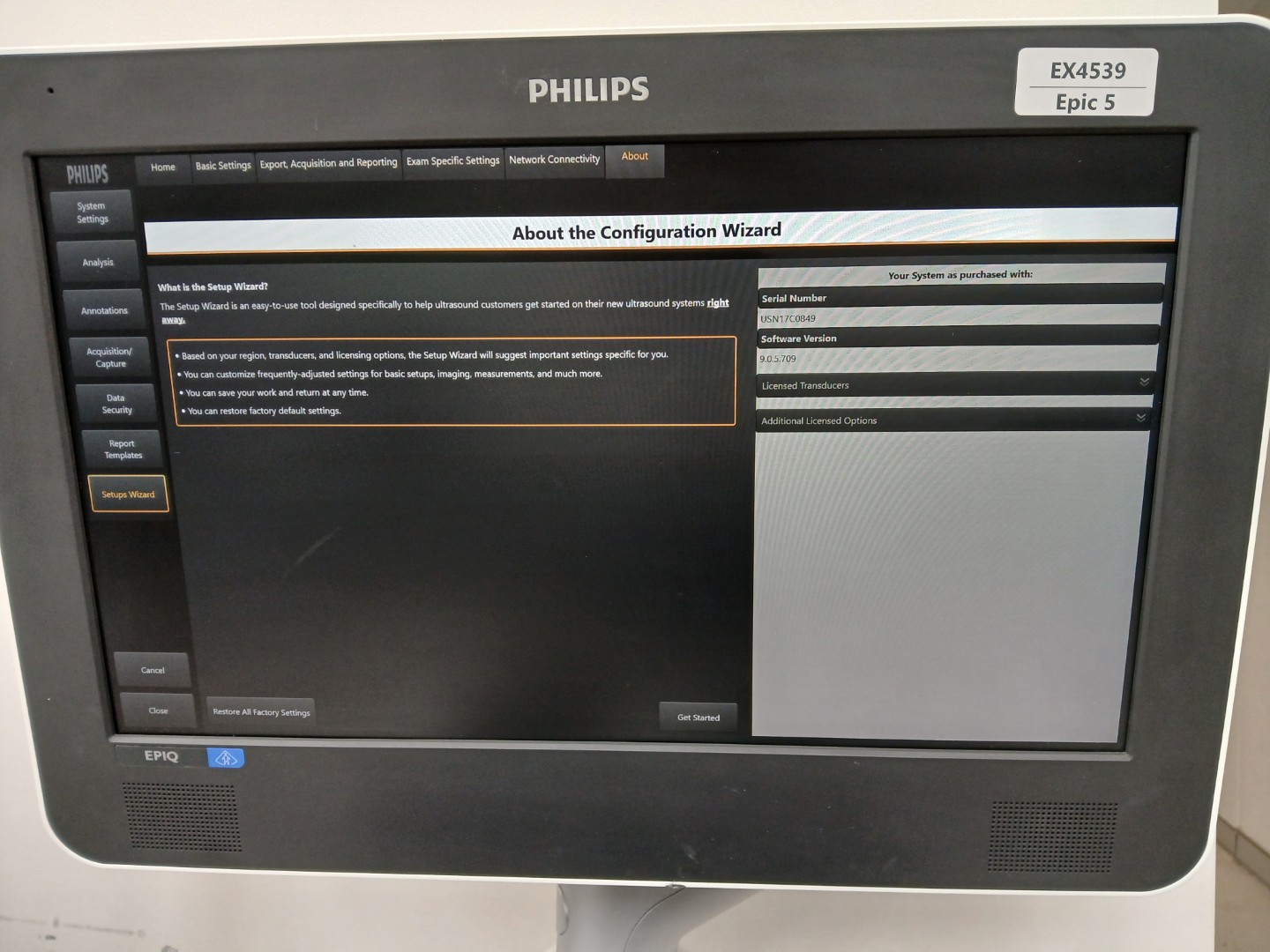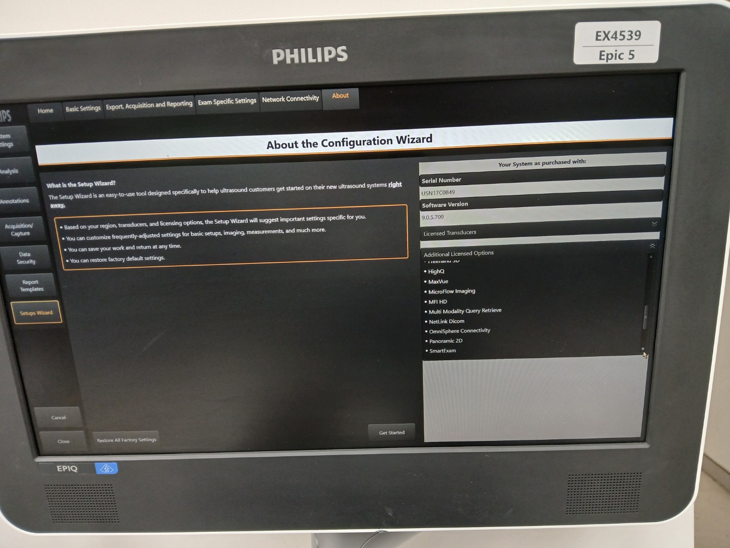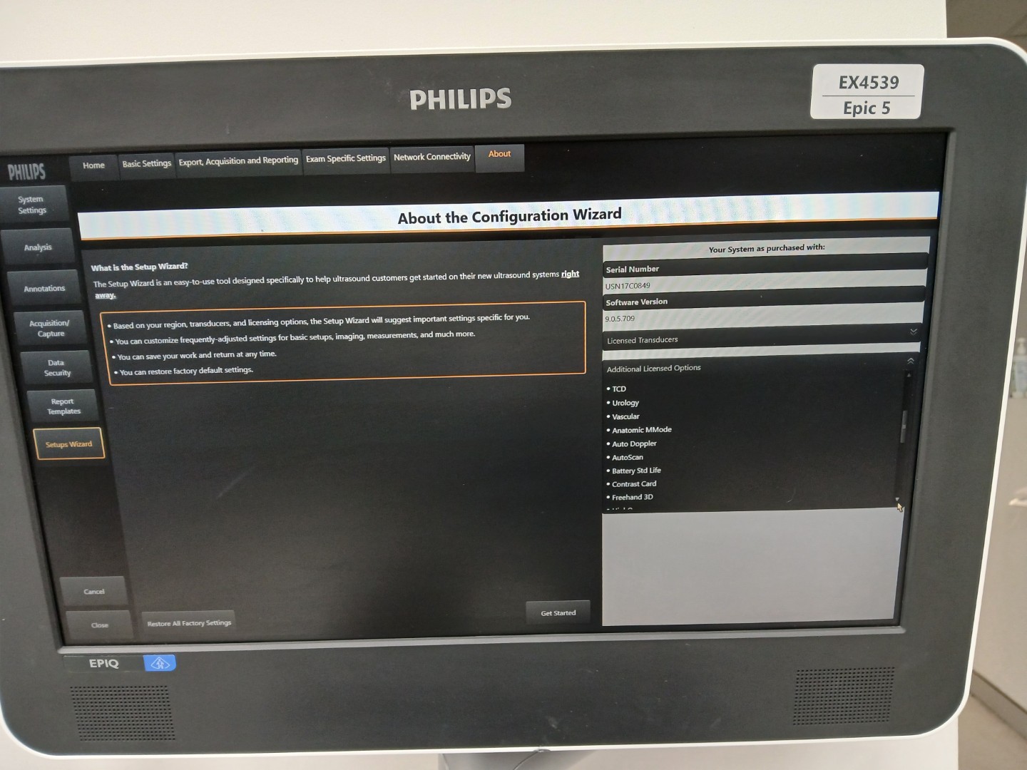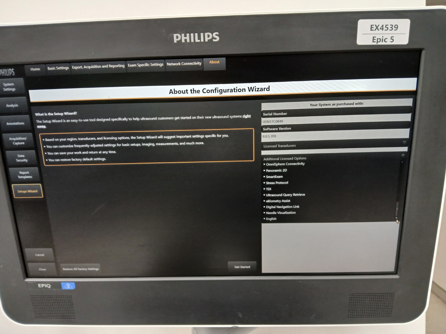 | Installed Options | : | Abdomen, Breast, Fetal Echo, Gyn, Intervention GI, Musculoskeletal, OB, Pediatric GI, Small Parts, TCD, Urology, Vascular, Anatomic MMode, Auto Doppler, AutoScan, Battery Std Life, Contrast Card, Freehand 3D, HighQ, MaxVue, Microflow Imaging, MFI HD, Multi Modality Query Retrieve, NetLink Dicom, OmniSphere Connectivity, Panaromic 2D, SmartExam, Stress Protocol, TDI, Ultrasound Query Retrieve, aBiometry Assist, Digital Navigation Link, Needle Visualization, English |