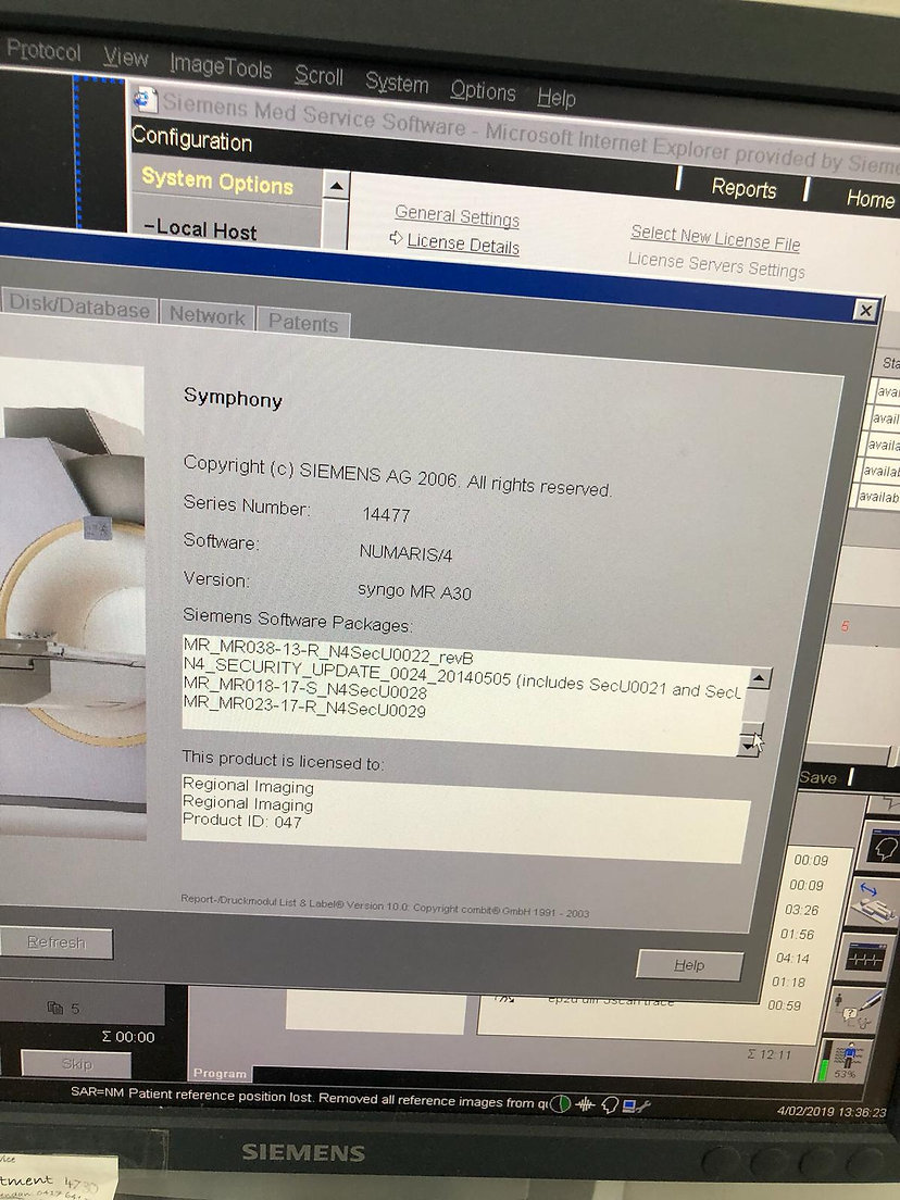 Siemens Symphony 1.5T MRI Electronics Manufactured: 2007 Current location : Australia (EX1040) Magnet Manufactured: 1998 Gradient type: Spirint Options: N11Adv3D, N11AdvTurbo, N11AdvAngio, N11PanoramaTable, N11EpiPerDiff, N11TGSE, CAP3D_FILTER_MIP, CAP3D_FILTER_SSD, CAP3D_VOIMODE, CAP3D_MAIN, GET_WORKLIST, N11CARDIAC, MRI_ARGUS_MAIN, MARI_ARGUS_VF_ANALYSIS, N_RoW, N11FlowQuant, N_CorePlus, N_CORE, MR_AdvNeuroPerfEval_Pro, MR_AdvNeuroPerfEval, MRI_ARGUS_FLOW_ANALYSIS, SprintGradient, N_MaestroClass, N_PAT_Basic, N_2D_PACE, N_PAT_Advanced, MPPS_SUPPORT, N_ProtSeqInline, MR_Composing_Spine, SYNGO_GENERAL_LICENSE, N_SWI, N_BLADE, MRI_CV_MAIN, N_COREPLUS, GET_WORKLIST, N_PROTSEQINLINE, N_MAESTROCLASS, N_PAT_BASIC, Receive Channels: 8 Channels We are looking to move this system ASAP and are considering all serious offer for this system