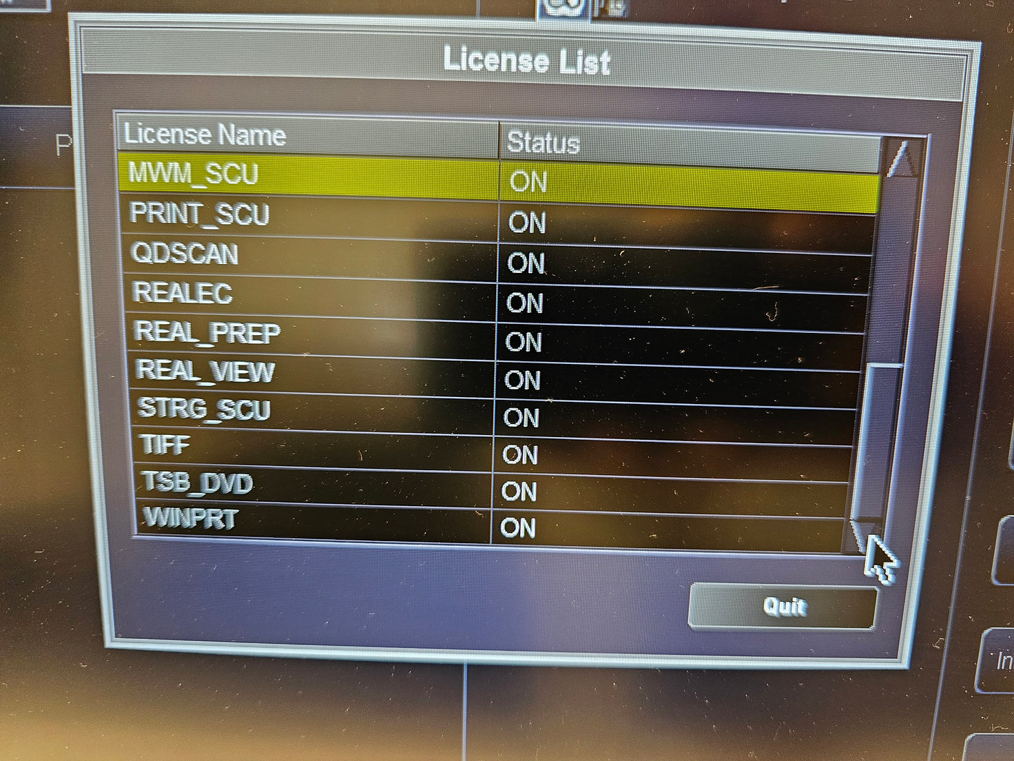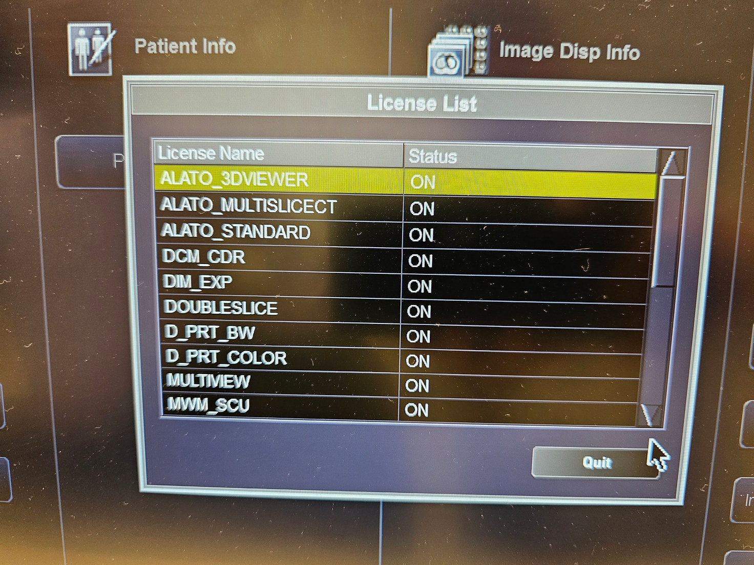 Opciones instaladas: ALATO_3DVIEWER, ALATO_MULTISLICECT, ALATO_STANDARD, DCM_CDR, DOUBLESLICE, D_PRT_BW, D_PRT_COLOR, MULTIVIEW, MVM_SCU, PRINT_SCU, QDSCAN, REALEC, REAL_PREP, REAL_VIEW, STRG_SCU, TIFF, TSB_DVD, WINPRT