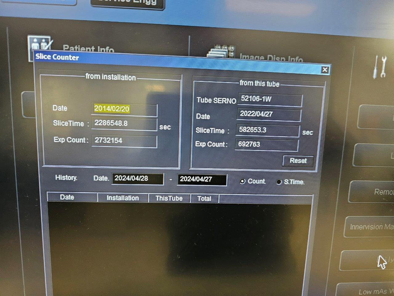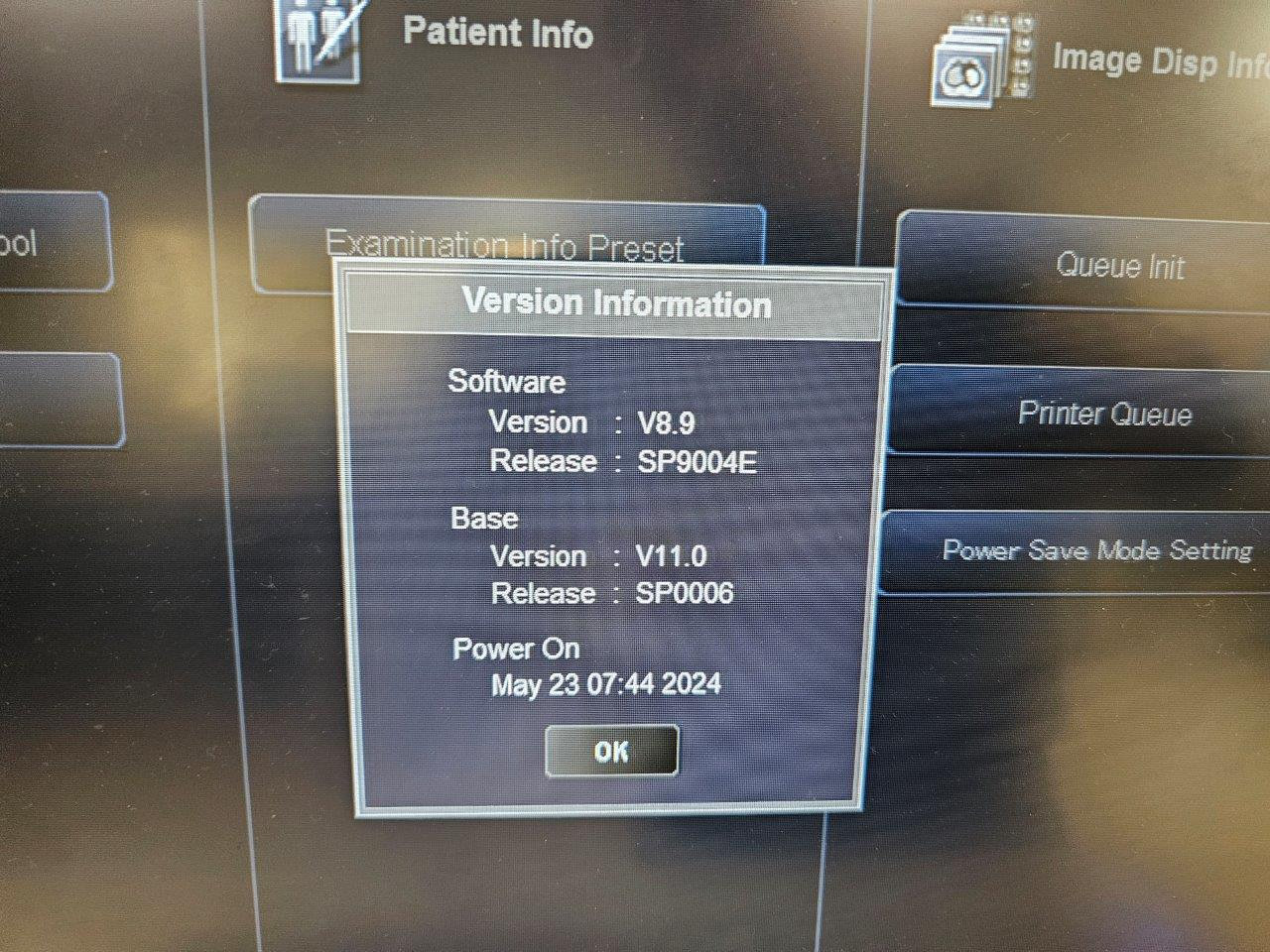 Opciones instaladas: CARDIAC, CARDIACPACTCH, CARDIACRECON,CONTROL DIARIO, DOUBLESLICE, D_PRT_BW, D_PRT_COLOR, EHCT_SCP, EHCT_SCU, FLUROSCOPIO, INYECTOR SYNC, MULTIVIEW, MWM_SCU, ORBITSUNC, OVER64HEL, PRINT_SCU, REALEC, REAL_PREP, REAL_VIEW, REGISTTOOL, SCAN320ROW, STRG_SCU, SUB_PROTOCOLO, TOS_SERVICE, VHP, WINPRT