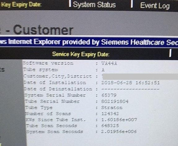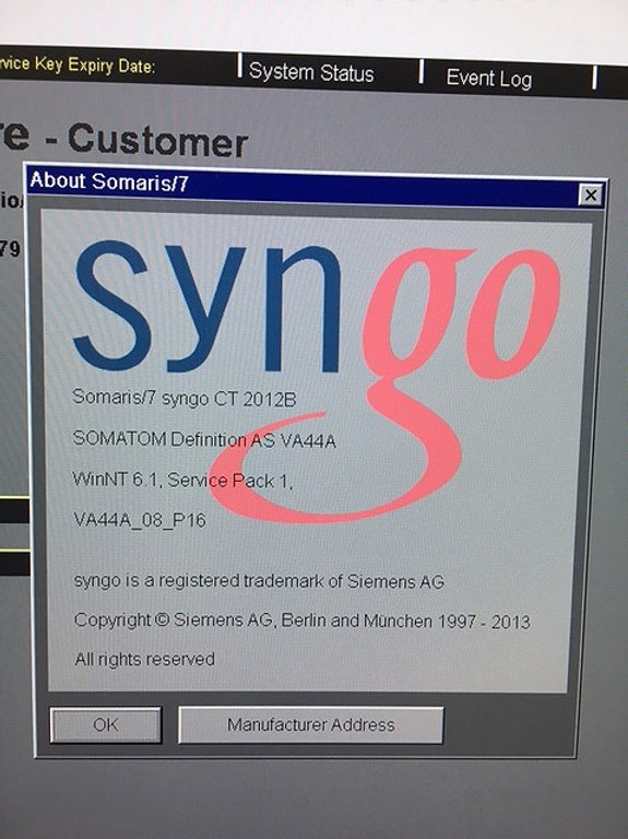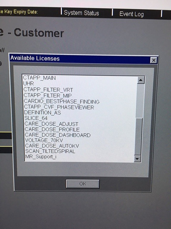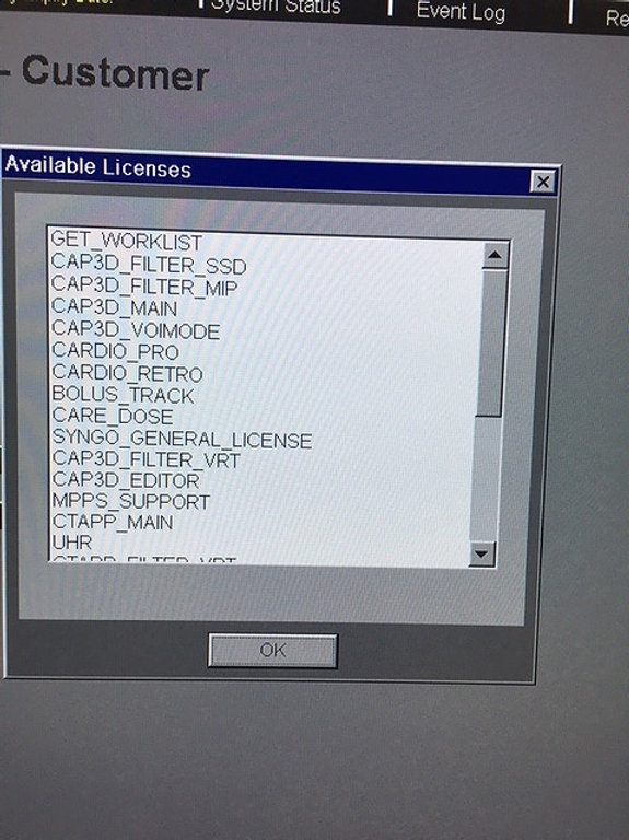 Options installées : GET_WORKLIST, CAP3D_FILTER_SSD, CAP3D_FILTER_MIP, CAP3D_MAIN, CAP3D_VOIMODE, CARDIO_PRO, CARDIO_RETRO, BOLU_TRACK, CARE_DOSE, SYNGO_GENERAL_LICENSE, CAP3D_FILTER_ VRT, CAP3D_EDITOR, MPPS_SUPPORT, CTAPP_MAIN, UHR, CTAPP_FILTER_VRT, CTAPP_FILTER_MIP, CARDIO_BESTPHASE_FINDING, CTAPP_CVF_PHASEVIEWER, DEFINITION_AS, SLICE_64, CARE_DOSE_ADJUST, CARE_DOSE_PROFILE, CARE_DOSE_DASHBOARD, VOLTAGE_70KV, CARE_DOSE_AUTOKV, SCAN_TILTEDSPIRAL, MR_Support_i