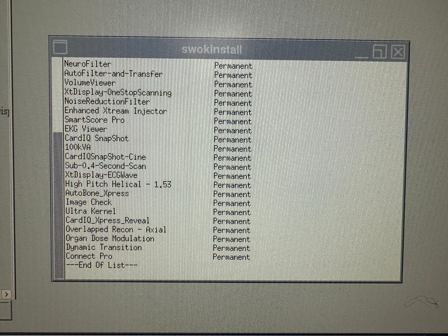Options : NeuroFilter, AutoFilter-and-Transfer, Volume Viewer, XtDisplay-OneStopScanning, NoiseReductionFilter, Enhanced Xtream Injector, SmartScore Pro, EKG Viewer, CardIQ SnapShot, 100 kVA, CardIQSnapShot-Cine, Sub-0,4-Second-Scan, XtDisplay-ECGWave, High Pitch Helical-1,53, AutoBone_Xpress, Image Check, Ultra Kernel, CardIQ_Xpress_Reveal, Overlapped Recon-Axial, Organ Dose Modulation, Dynamic Transition, Connect Pro