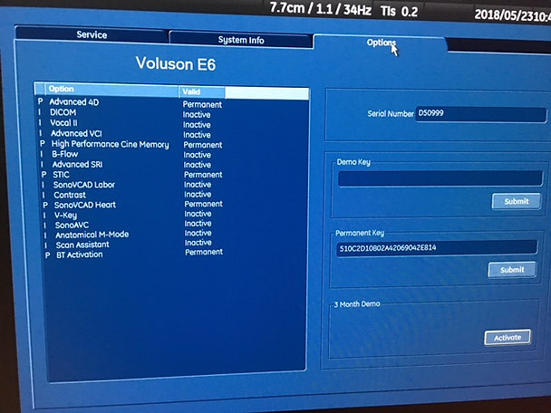 Options installées : Advanced 4D, High Performance Cine Memory, STIC, SonoVCAD Heart, BT Activation
