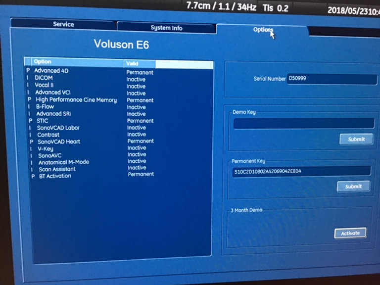 Options installées : Advanced 4D, mémoire Cine haute performance, STIC, SonoVCAD Heart, activation BT