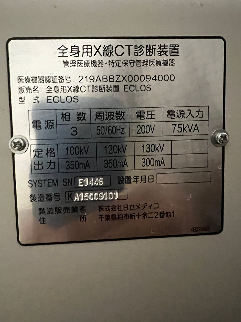Hitachi Eclos 16 slice CT Scanner d’occasion Numéro de série : E1446 Fabriqué : 2011 Localisation actuelle : Japon (NEX143) Tube remplacé : 2016 Logiciel d’application : V2.11 Logiciel système : V2.10 Générateur : 48 KW Tube : 3.5 MHU Nombre de tubes actuels = 396,608