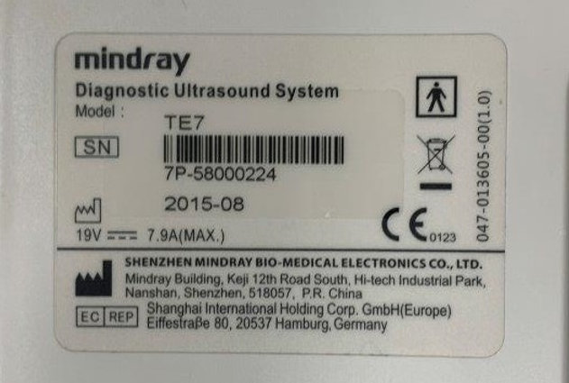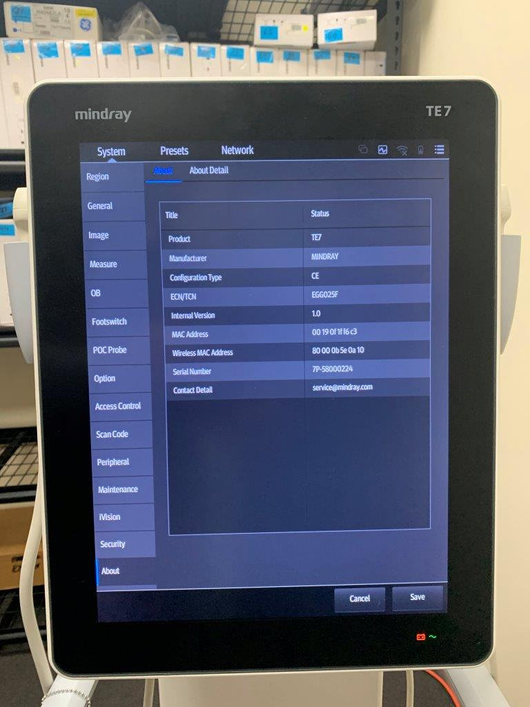 Mindray TE7 point of care ultrasounds – Ex demo condition (multiple machines available) Manufactured : 2015-08 Location : Australie (EX-LHC107) Options installées : OBS/GYN/ABD/General/Urology/Cardiology/Small Parts Package Diverses sondes au choix : Convex, Linear, Phased array