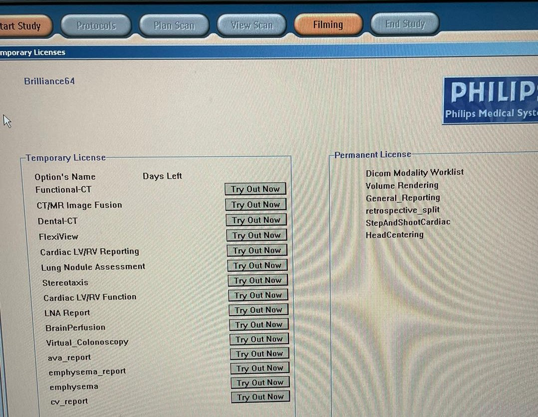 Scanner CT Philips Brilliance 64 coupes Fabriqué : 2011 Emplacement actuel : Australie (EX2482) Type de tube : Tube MRC 800 remplacé : 2011