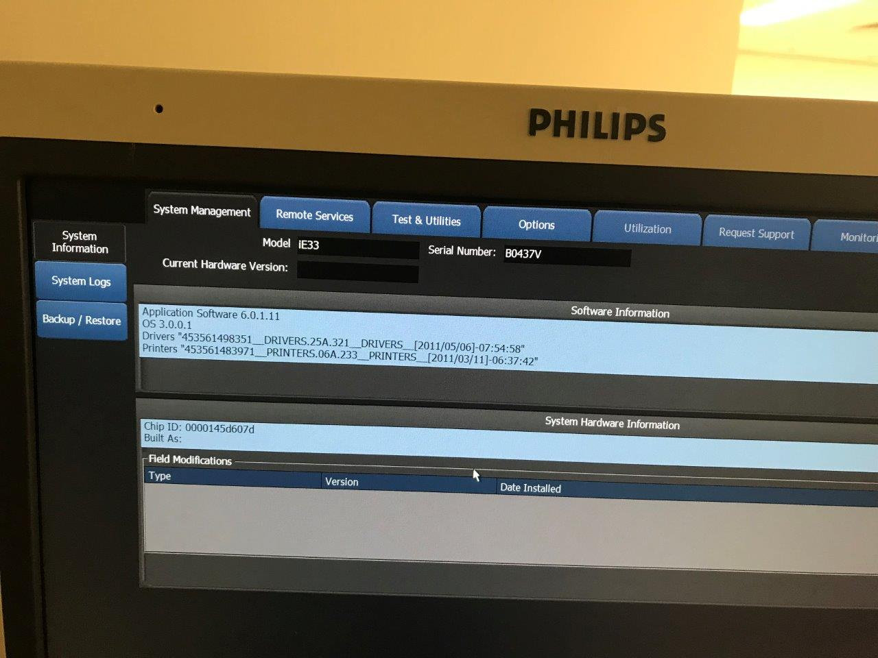 Used Philips iE33 Cart G.1 Manufactured: June 2011 Location Australia (EX 953) S/W ver: 6.0.1.11 Installed options: Vascular, Adult Cardiology, Pediatric Cardiac, TCD, Tissue Doppler Imaging, Netlink DICOM 3.0, Acquisition Protocol (Stress Echo), SmartExam, English, PAL Video option Probe: S5-1 Other probes also available