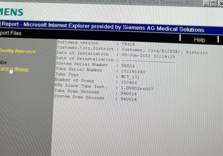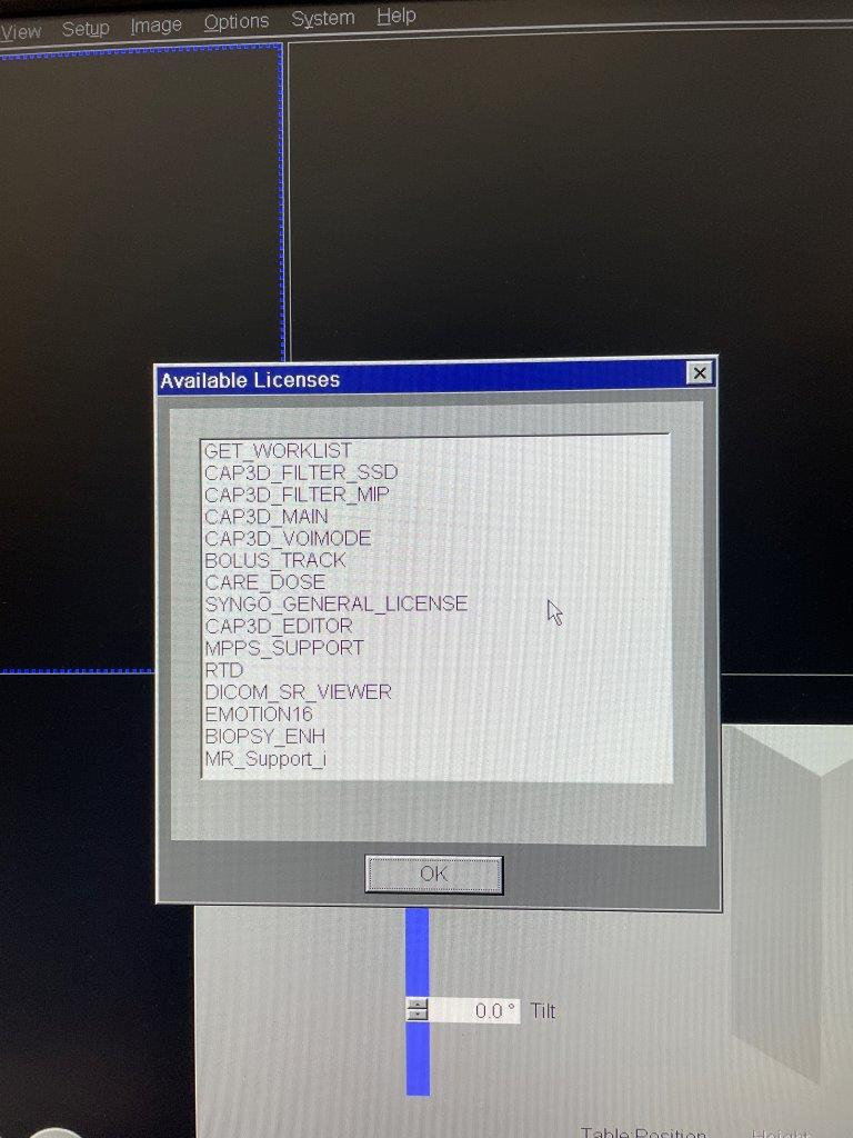 Scanner CT 16 coupes Siemens Emotion avec Care Dose Fabriqué : juin 2011 Lieu : États-Unis (EX2625) Type de tube : DURA 422-MV / MCT_172 Tour ICS : 10B, Tour IRS : 10G Logiciel ICS : VB42B Secondes de numérisation du tube : 940 614 Tube changé : 2011 (tube d’origine) Options installées : GET_WORKLIST, CAP3D_FILTER_SSD, CAP3D_FILTER_MIP, CAP3D_MAIN, CAP3D_VOIMODE, BOLUS_TRACK, CARE_DOSE, SYNGO_GENERAL_LICENSE, CAP3D_EDITOR, MPPS_SUPPORT, RTD, DICOM_SR_VIEWER, EMOTION16, BIOPSY_ENH, MR_Support_i