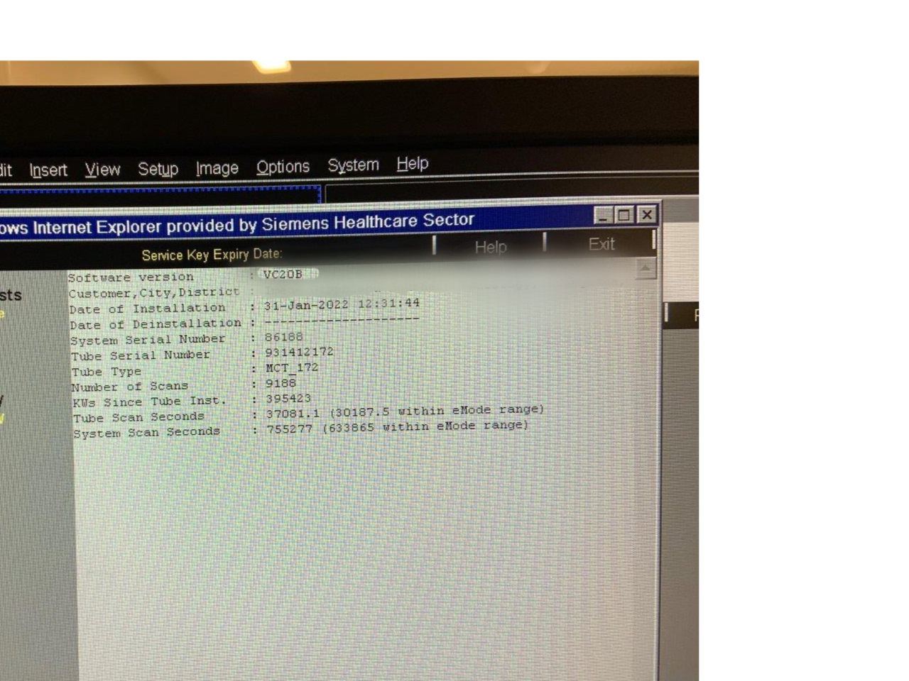 Escáner CT Siemens Emotion 16 Slice usado con tubo 2022 y dosis Care S.No.-86188 Ubicación: EE. UU. (EX2916) Fabricado: septiembre de 2013 Tipo de tubo: DURA 422-MV / MCT_172 Torre ICS: 11B, torre IES: 10G ICS Software: Segundos de escaneo de tubo VB42B: 37.081,1 Cambio de tubo: 31 de enero Opciones instaladas 2022: CAP3D_ BONEREMOVAL, DICOM_SR_VIEWER, SCAN_AUTOREGION, EMOTION16, RECON_ITERATIVE_IRIS, MR_Support_i, Table_Horizon_Compensation, GET_WORKLIST, CAP3D_FILTER_SSD, CAP3D_FILTER_MIP, CAP3D_MAIN, CAP3D_VOIMODE, BOLUS_TRACK, CARE_DOSE, SYNGO_GENERAL_LICENSE, CAP3D_FILTER_VRT, CAP3D_EDITOR, MPPS_SUPPORT, VOLUME_WORKFLOW, RTD, RECON_PLUS
