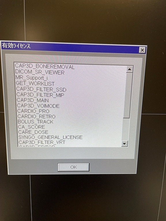 Options installées : CAP3D_BONE REMOVAL, DICOM_SR_VIEWER, MR_Support_i, GET_WORKLIST, CAP3D_FILTER_SSD, CAP3D_FILTER_MIP,CAP3D_MAIN, CAP3D_VOIMODE, CARDIO_PRO, CARDIO_RETRO, BOLUS TRACK, CA_SCORE, CARE_DOSE, SYNGO_GENERAL_LICENSE, CAP3D_FILTER_VRT, CAP3D_EDITOR, HIGH_SPEED, POWER_TUBE, CARDIAC_SPEED_037, MPPS_SUPPORT, VOLUME_WORKFLOW, SPEED_033, SENSATION_CARDIAC64