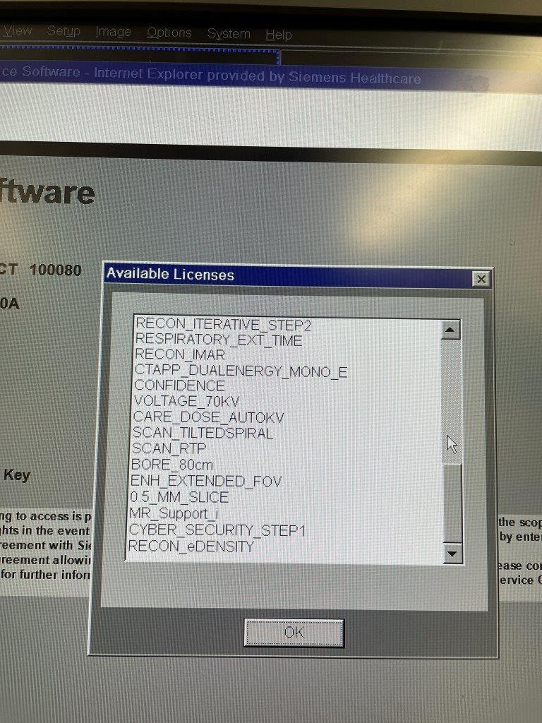 Options : GET_WORKLIST, CAP3D_FILTER_SSD, CAP3D_FILTER_MIP, CAP3D_MAIN, CAP3D_VOIMODE, BOLUS_TRACK, CARE_DOSE, SYNGO_GENERAL_LICENSE, CAP3D_FILTER_VRT, CAP3D_EDITOR, MPPS_SUPPORT, EXTENDED_FOV, CTAPP_MAIN, INJ_CONNECTION, RESPIRATORY_RETRO, RESPIRATORY_PRO, CTAPP_FILTER_MIP, SLICE_64, INJ_CONNECTION_ROW, SCAN_AUTOREGION, DE_SINGLE_SOURCE_RESEARCH, CARE_DOSE_ADJUST, CARE_DOSE_PROFILE, CARE_DOSE_DASHBOARD, RECON_ITERATIVE_STEP2, RESPIRATORY_EXT_TIME, RECON_IMAR, CTAPP_DUALENERGY_MONO_E, CONFIDENCE, VOLTAGE_70KV, CARE_DOSE_AUTOKV, SCAN_TILTEDSPIRAL, SCAN_RTP, BORE_80cm, ENH_EXTENDED_FOV, 0.5_MM_SLICE, MR_SUPPORT_i, CYBER_SECURITY_STEP1, RECON_eDENSITY