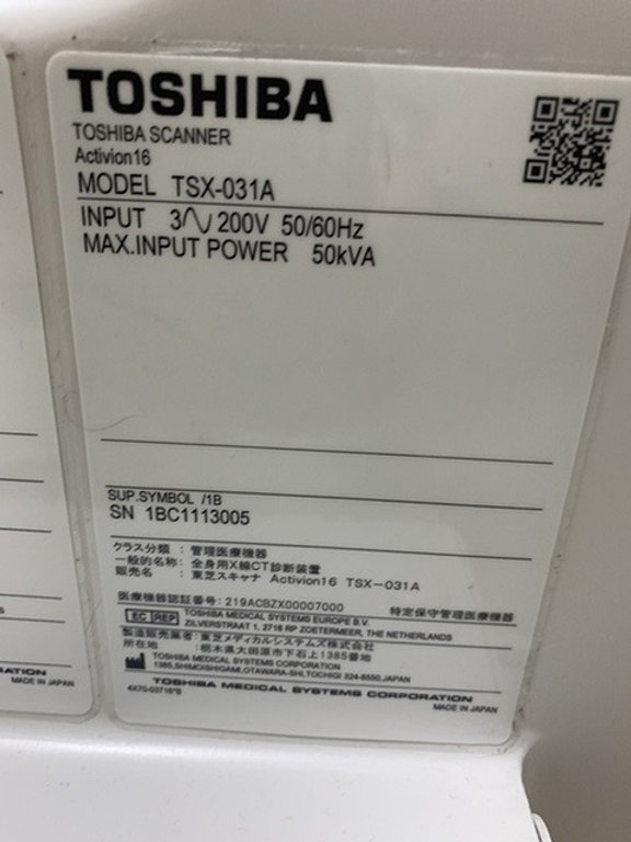 Toshiba Activion 16 CT Scanner YOM : 2011 Location : Japon (NEX139) Numéro de série : 1AA1032670 Tube installé : Juillet 2016 Temps de coupe : 172 773 Nombre d’expositions : 167,861