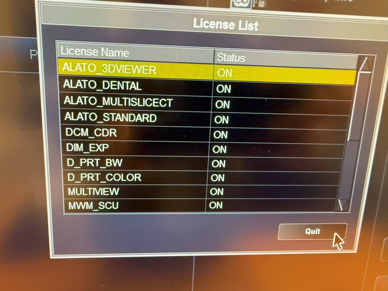 Options installées : ALATO_3DVIEWER, ALATO_DENTAL, ALATO_MULTISLICECT, ALATO_STANDARD, DCM_CDR, DCM_RAW, DIM_EXP, D_PRT_BW, D_PRT_COLOR, MULTIVIEW, MWM_SCU, PRINT_SCU, REALEC, REAL_PREP, REAL_VIEW, STRG_SCU, TIFF, TSB_DVD, WINPRT