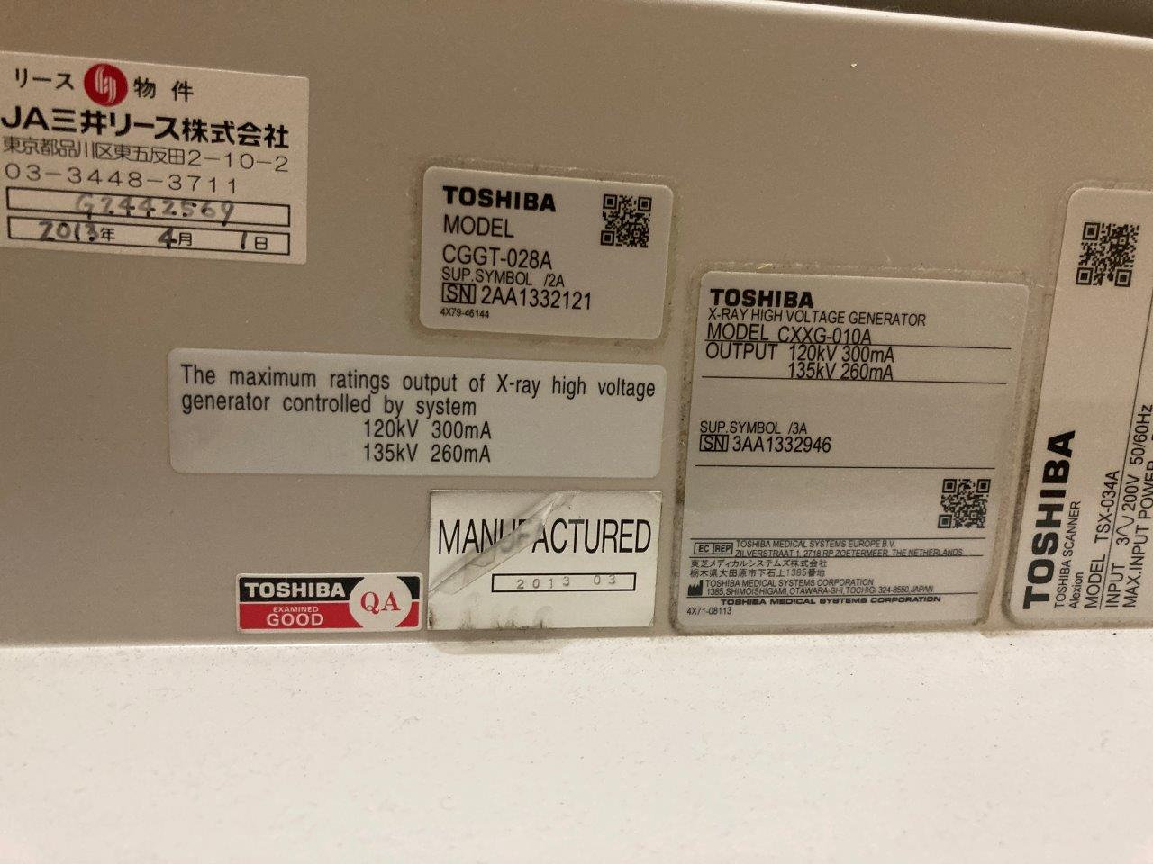 Toshiba Alexion Advance CT Scanner (TSX-034A) d’occasion avec excellent tube Fabriqué : Mars 2013 Lieu : Japon (NEX147) Version du logiciel : V4.86JR015 Nombre de coupes actuel : 54,614 Options installées : ALATO_3DVIEWER, ALATO_MULTISLICECT, ALATO_STANDARD, DCM_CDR, DIM_EXP, DOUBLESLICE, D_PRT_BW, D_PRT_COLOR, MULTIVIEW, PRINT_SCU, REALEC, REAL_PREP, REAL_VIEW,STRG_SCU, TIFF, TSB_DVD, WINPRT