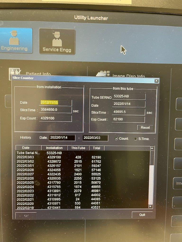 Toshiba Aquilion One 640 Slice CT – CT haut de gamme avec tube et amplificateur presque neufs Fabriqué par le détecteur : 2012 Version du logiciel : V7.0, Version de base : V11.0 Emplacement : États-Unis (EX2782) Type de tube : MCS-7088A (Megacool CXB-750E) Tube fabriqué : février 2019 Nombre d’expositions actuel : 62 190 Temps de tranche : 49 895,5 secondes Dernier changement de tube : 2022/01/14 Détecteur remplacé par la marque nouveau 2 semaines avant le retrait Options : Cardiac, CardiacPatch, CardiacRecon, Commit SCU, DE_MEAS_TOOL, DE-SCAN, DOUBLESLICE, D_PRT_BW, D_PRT_COLOR, EHCP_SCP, EHCT_SCU, HADSWITCH, INJECTORSYNC, MULTIVIEW, MWM_SCU, ORBITSYNC, OVER64HEL, PPS_SCU, PRINT_SCU, QR_SCP, QR_SCU, REALEC, REAP_PREP, REAP_VIEW, REGISTTOOL, SCAN320ROW, STRG_SCU, TOS_SERVICE, VHP, WINPRT