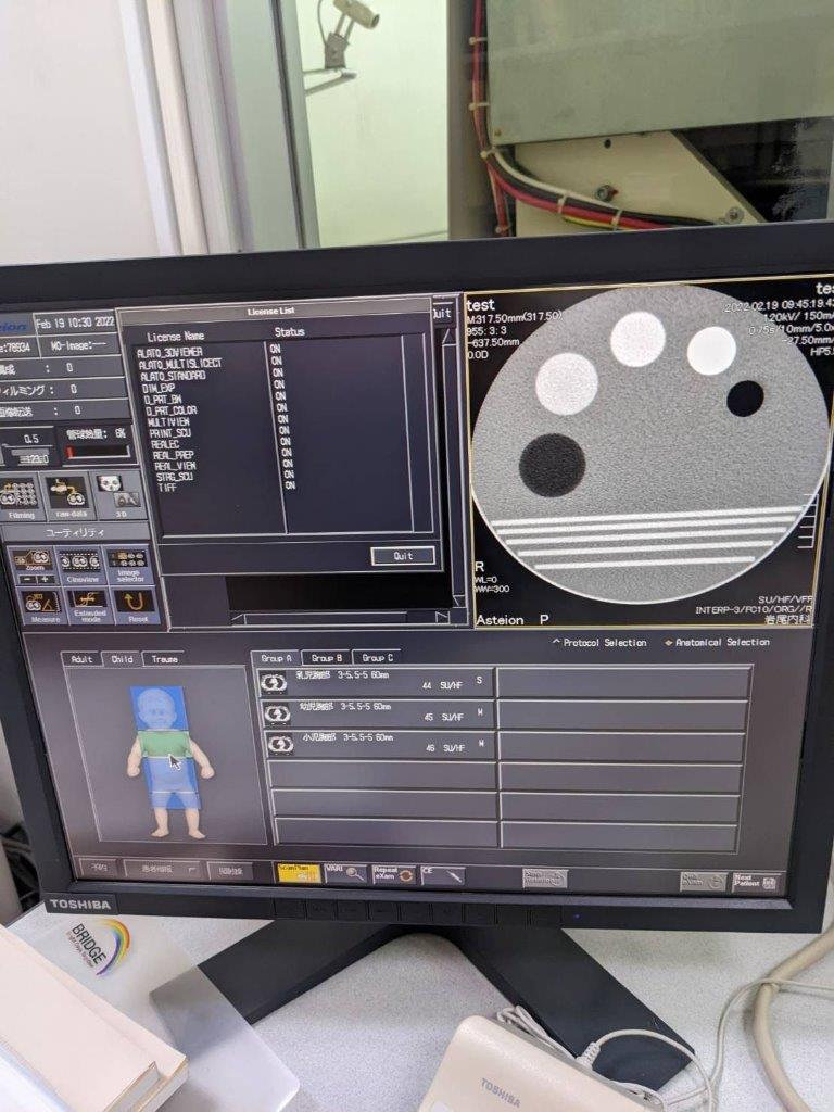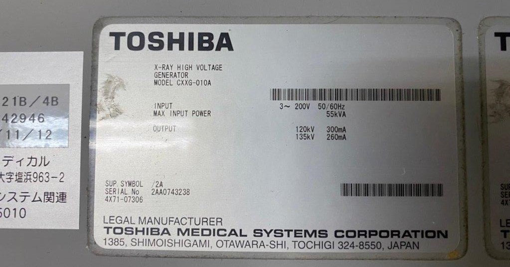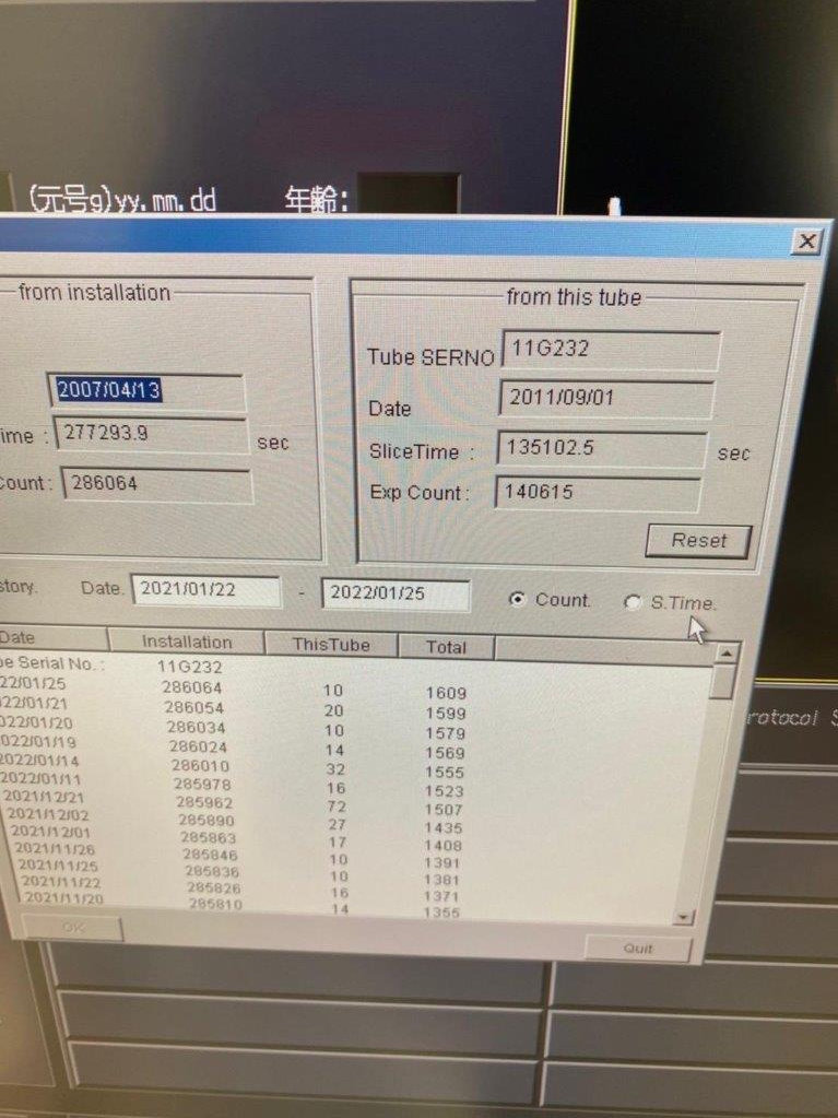 Toshiba Asteion S4 CT scanner d’occasion Fabriqué : Avril 2007 Localisation actuelle : Japon (NEX110) Nombre d’expositions actuel : 140,615 Temps de coupe : 135,102.5 sec Dernier changement de tube : 2011/09/01 Type de tube : CXB-400C (juillet 2011) Options installées : ALATO_3DVIEWER, ALATO_MULTISLICECT, ALATO_STANDARD, DIM_EXP, D_PRT_BW, D_PRT_COLOR, MULTIVIEW, PRINT_SCU, REALEC, REAL_PREP, REAL_VIEW, STRG_SCU, TIFF