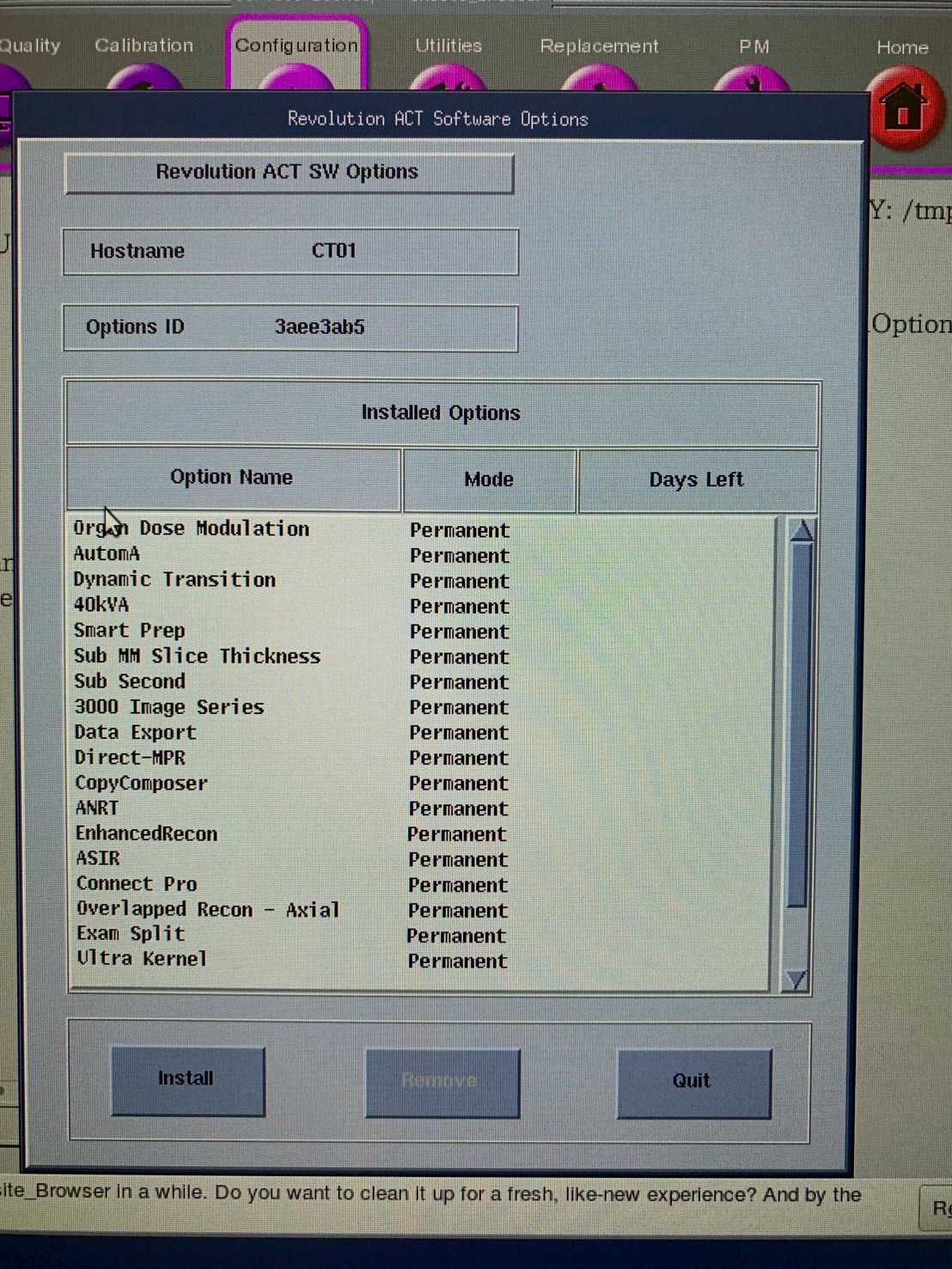 | Installed Options | : | Organ Dose Modulation, AutomA, Dynamic Transition, 40kVA, Smart Prep, Sub MM Slice Thickness, Sub Second, 3000 Image Series, Data Export, Direct-MPR, CopyComposer, ANRT, EnhancedRecon, ASIR, Connect Pro, Overlapped Recon – Axial, Exam Split, Ultra Kernel, VolumeViewer, SmartPlan, AutoBone_Xpress |