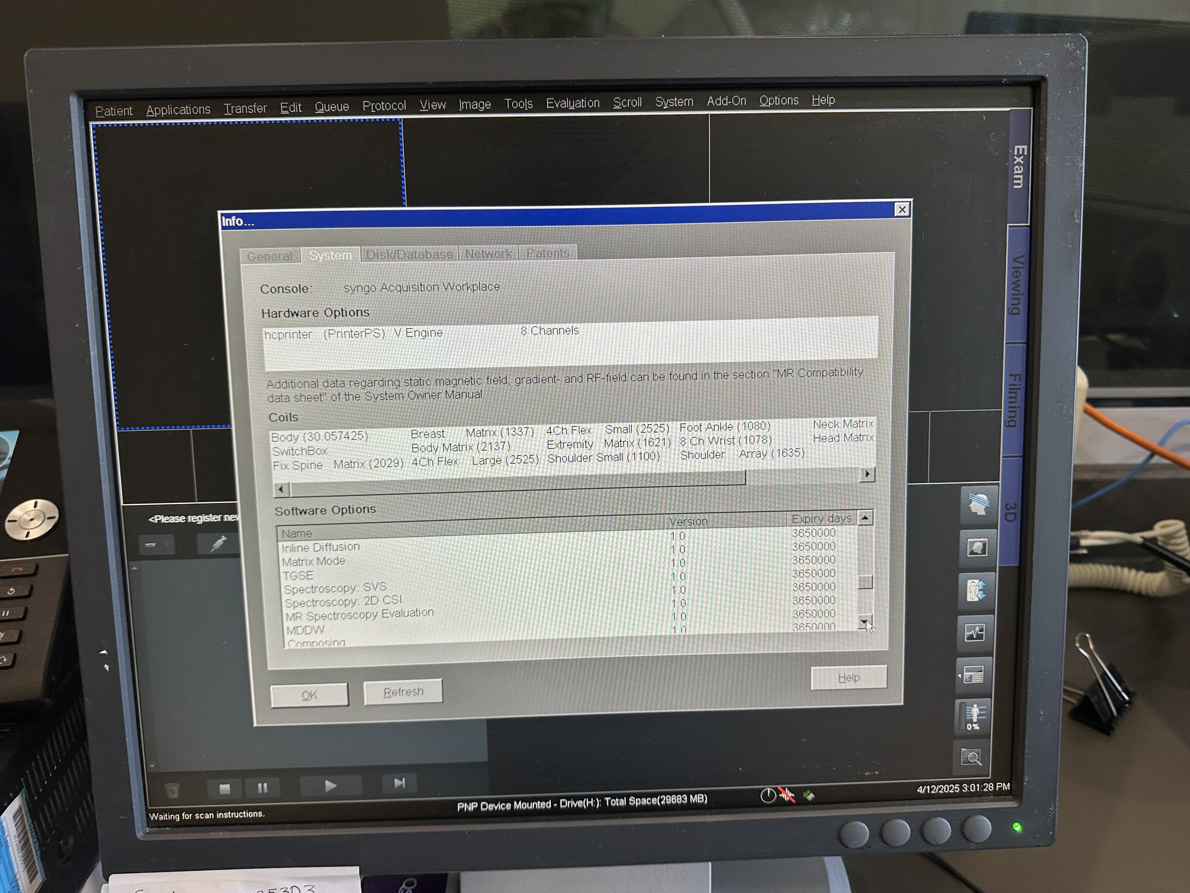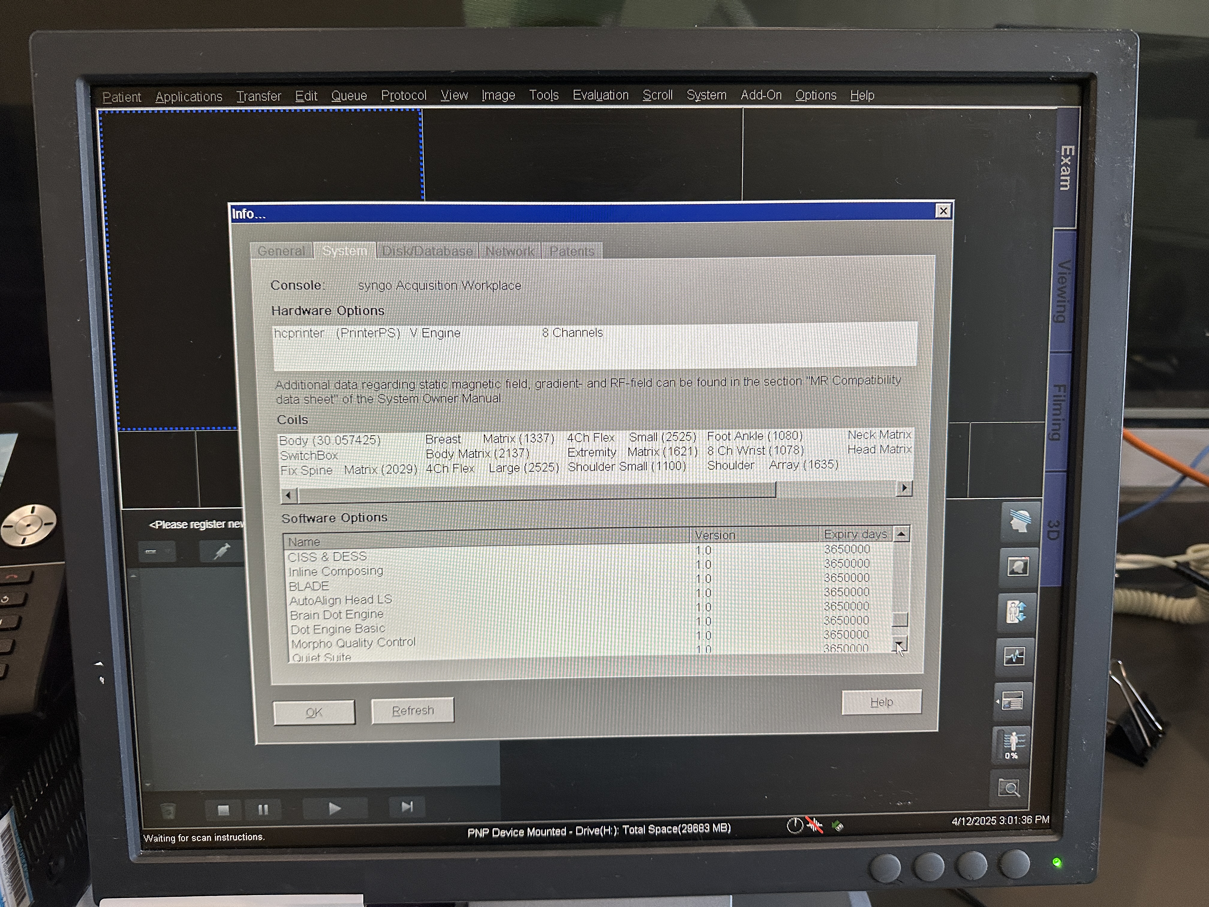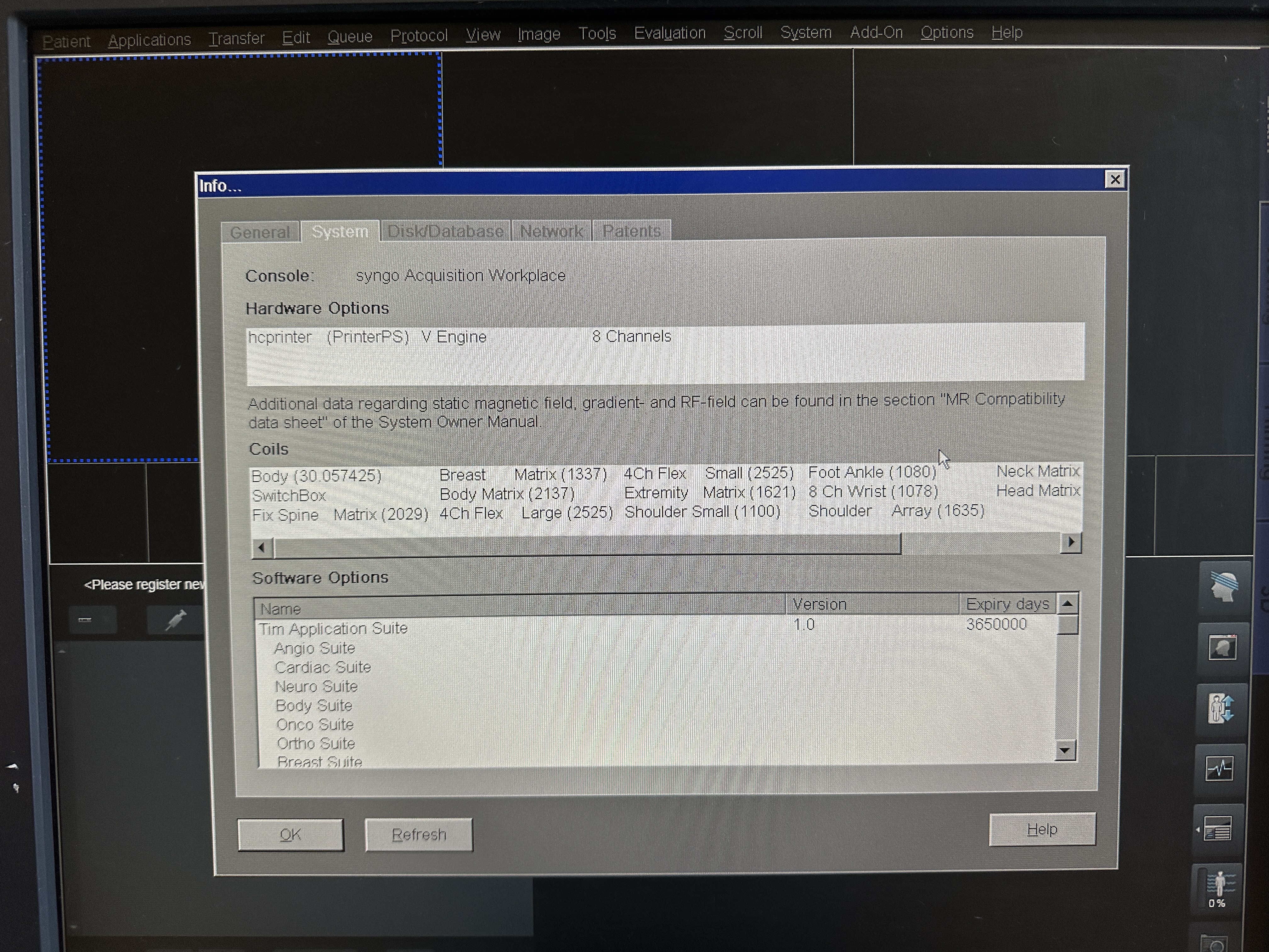 Installed Options : Tim_Application_Suite, syngo_General_License, 3D_Usage_License, 3D_MPR, 3D_MIP, 3D_SSD, Argus_Viewer, Worklist, Phoenix_ZIP, syngo_Remote_Assist, iPAT_Extensions, Motion_Correction_NR, Image_Filter_Software, MPPS, Inline_3D_Distortion_Correction, 3D_Distortion_Correction, Inline_Diffusion, Matrix_Mode, TGSE, Spectroscopy: SVS, Spectroscopy: 2D CSI, MR Spectroscopy Evaluation, MDDW, Composing, CISS&DESS, Inline_Comsposing, BLADE, Auto_Align_Head_LS, Brain_Dot_Engine, Dot_Engine_Basic, Morpho_Quality_Control, Quiet_Suite, VARP_VAT, CAIPIRINHA, Fast_Dixon