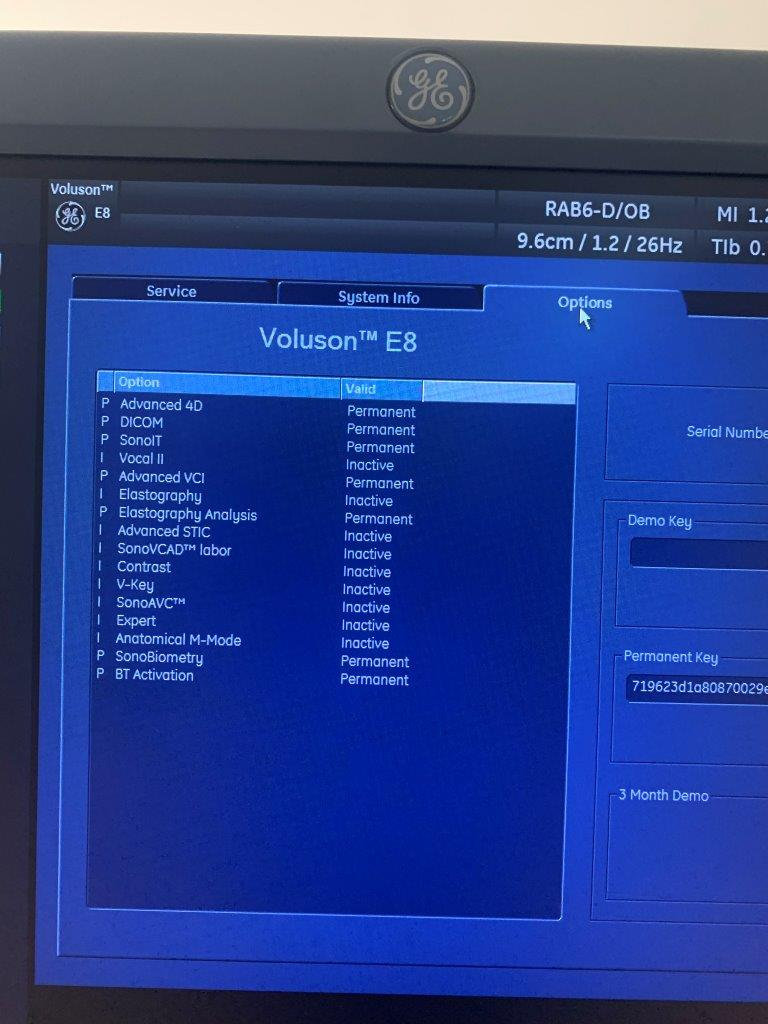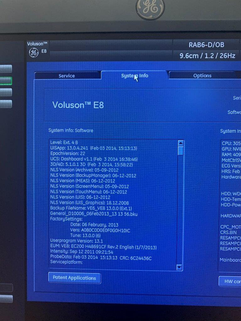 GE Voluson E8_BT13 d’occasion Fabriqué : September 2012 Location : Australie (EX1990) Software Ver : 13.0.4.241 Options installées : Advanced 4D, DICOM, SonoIT, Advanced VCI, Elastography Analysis, SonoBiometry, BT Activation Choix de sondes : C1-5D, RAB6-D, 9L-D, ML6-15D Imprimante Sony B&W