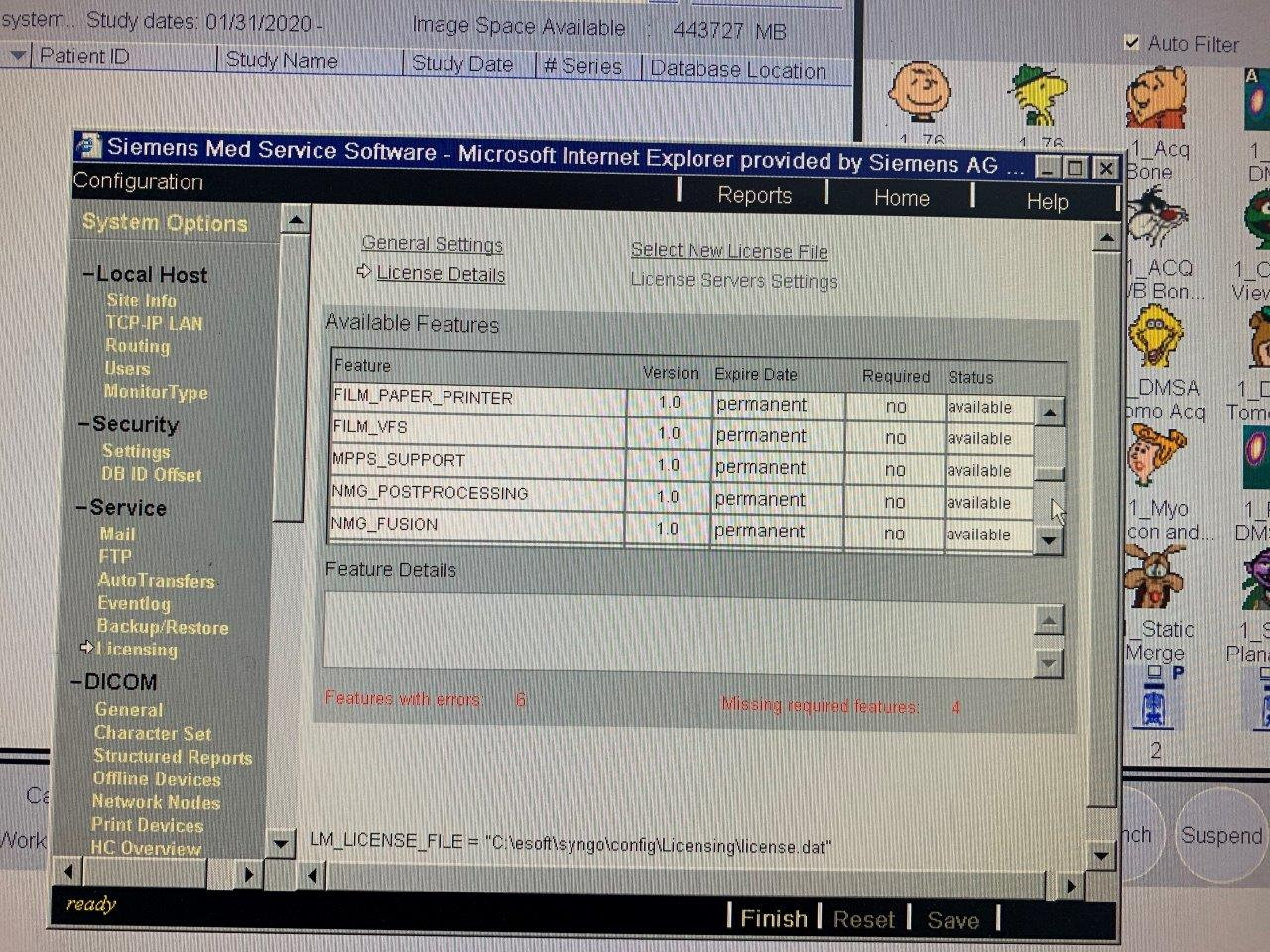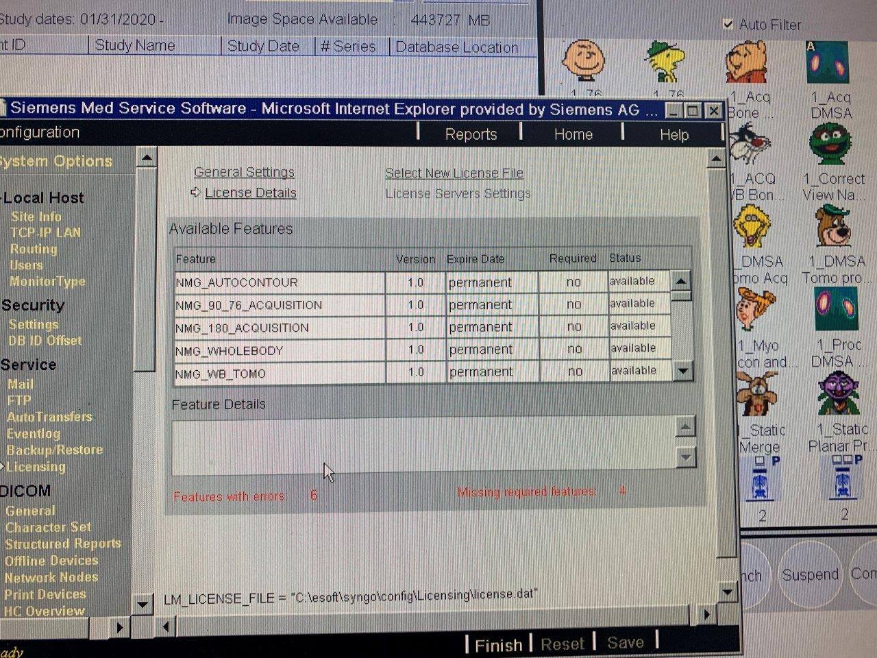 NMG_AUTOCONTOUR, NMG_90_76_ACQUISITION, NMG_180_ACQUISITION, NMG_WHOLEBODY, NMG_WB_TOMO, NMG_ACQUISITION, NMG_DISPLAY, NMG_PROCESSING, GET_WORKLIST, NMG_CEDERSQPS, NMG_CEDERSQBS, NMG_CEDERSQGS, SYNGO_GENERAL_LICENSE, FILM_PAPER_PRINTER, FILM_VFS, MPPS_SUPPORT, NMG_POSTPROCESSING, NMG_FUSION, NMG_ESOFT_2_5, NMG_OSEM2D_CARDIAC, NMG_SIEMENSONLY, NMG_FLASH3D_GENERAL, NMG_FLASH3D_CARDIAC, NMG_ESOFT_3_0, NMG_ESOFT_3_5, NMG_PROCESSING_PLANAR, NMG_SCATTER, CAP3D_MAIN, CAP3D_VOIMODE