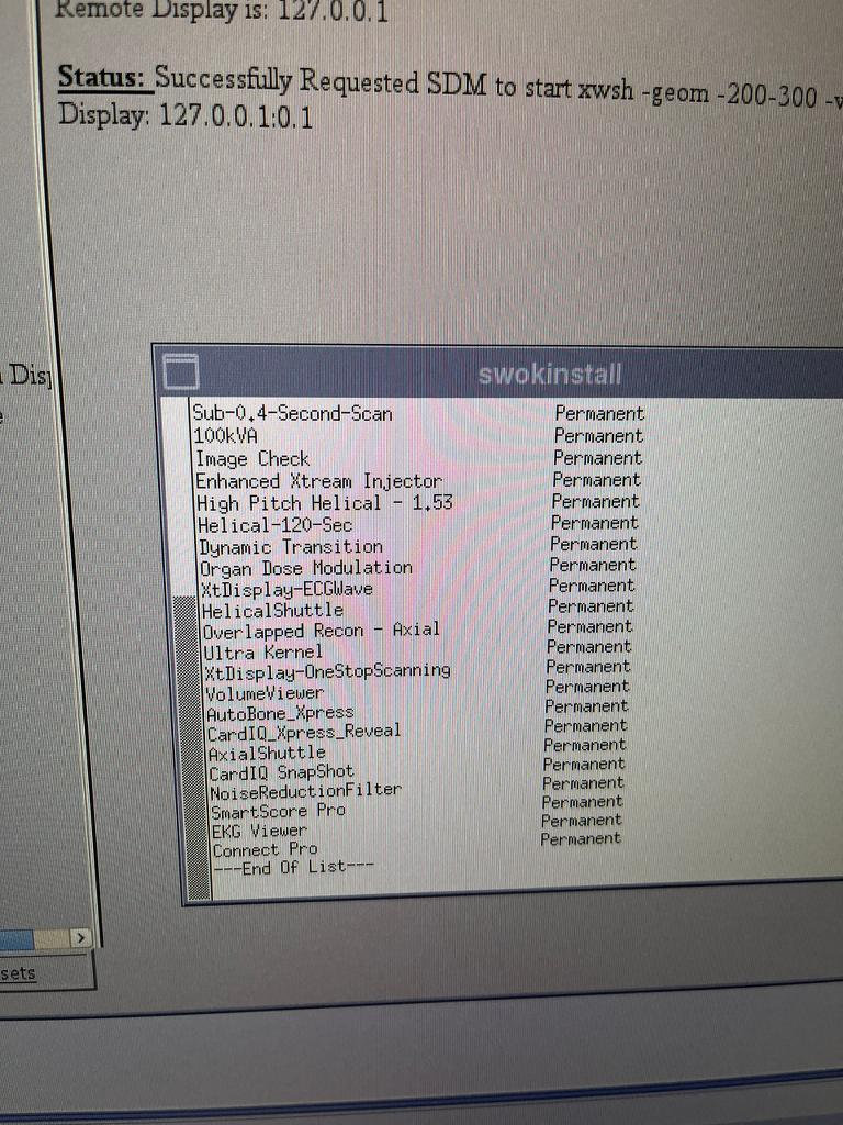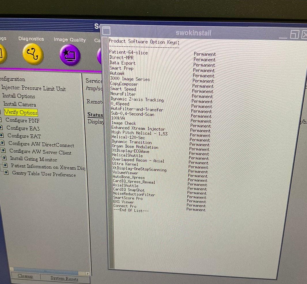 Options: Dynamic Transition , Patient-64-slice, Overlap Recon -axial Direct-MPR, Data Export, Smart Prep, AutomA, 3000 Image Series, CopyComposer, Smart Speed, Neuro filter , dynamic Z axis tracking , 100KVA, 0_4Speed, Sub-0.4-Second-Scan, Connect Pro, SmartScore Pro, Auto filter and transfer , enjanced Xtream injector , CardIQ SnapShot, EKG Viewer, VolumeViewer, Exam Split, High pitch Helical , Image check NoiseReductionFilter, AxialShuttle, CardIQSnapShot-Cine, XtDisplay-ECGWave, Ultra Kernel, Organ dose modulation