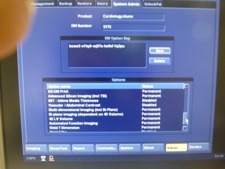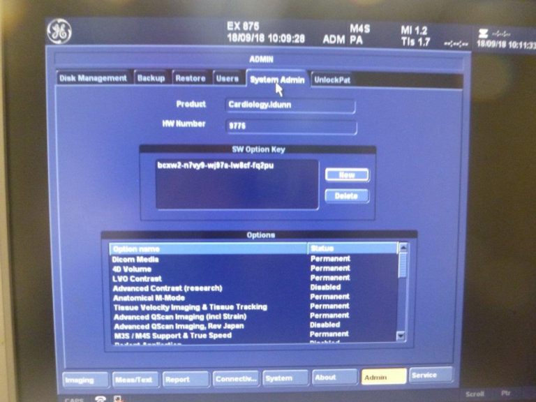| Installed Options | : | DICOM Media, 4D Volume, LVO Contrast, Tissue Velocity Imaging & Tissue Tracking, Anatomical M Mode, Advanced QScan imaging, M3S/M4S Support & True Speed, Q Analysis, Blood Flow Imaging, EchoPAC, EchoStress, MPEGvue, Echo DICOM, DICOM Modality W/L, DICOM Print, , Advanced QScan imaging (incl TSI), Multi-dimensional Imaging (incl Bi-plane), Bi-plane imaging, 4D LV Volume, Automated Functional Imaging, Vivid 7 Dimension |