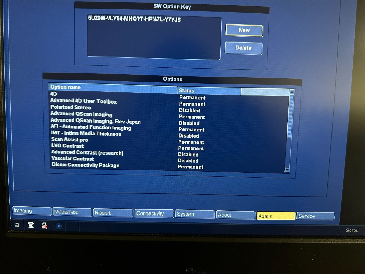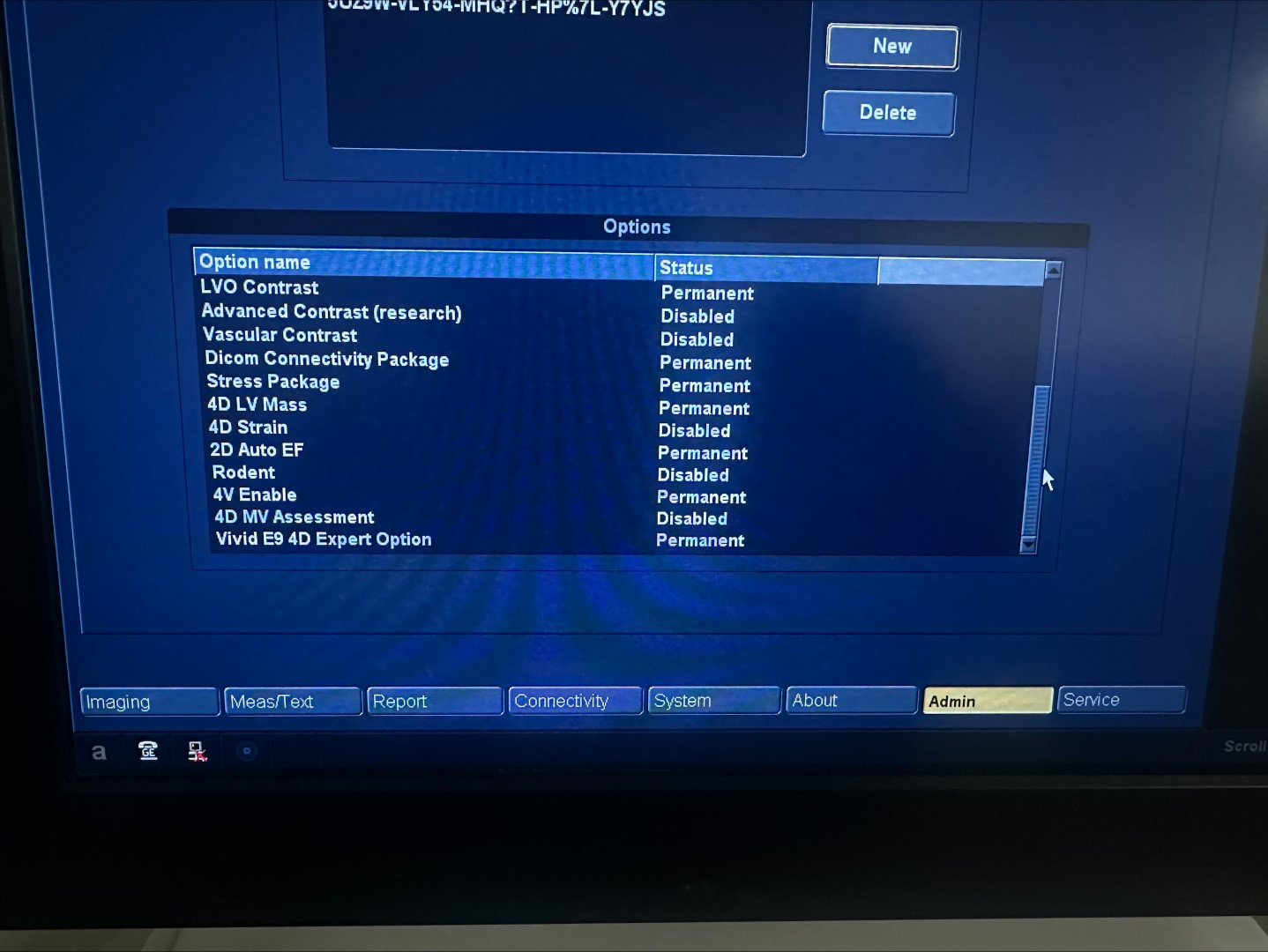 Installed Options : 4D, Advanced 4D User Toolbox, Advanced Qscan Imaging, AFI, Scan Assist pro, LVO Contrast, Dicom, Stress, 4D LV Mass, 2D Auto EF, 4V Enable, Vivid E9 4D Expert Option