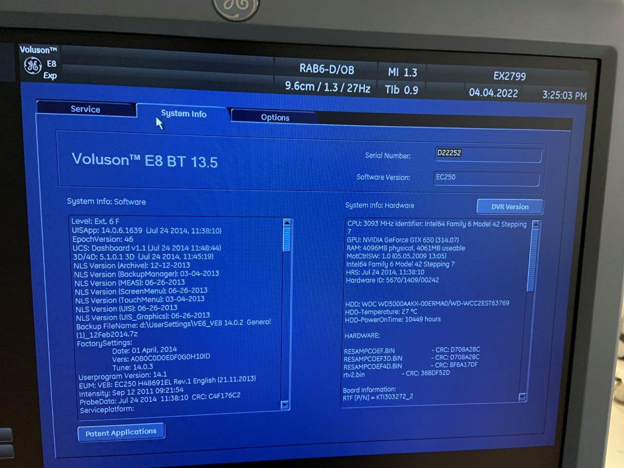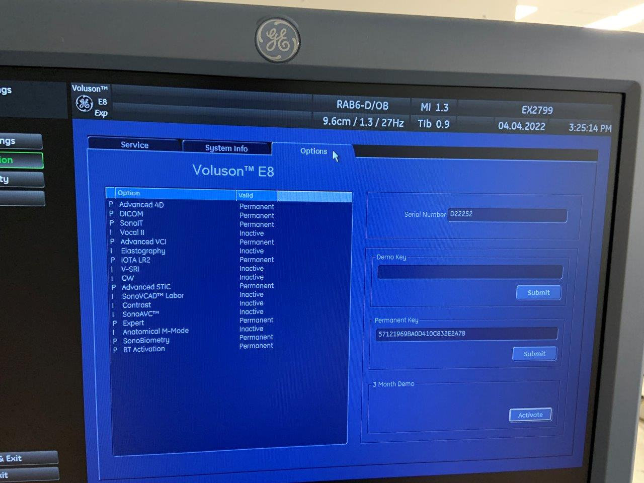 | Installed Options | : | Advanced 4D, DICOM, SonoIT, Vocal II, Advanced VCI, IOTA LR2, Advanced STIC, Expert, SonoBiometry, BT Activation |