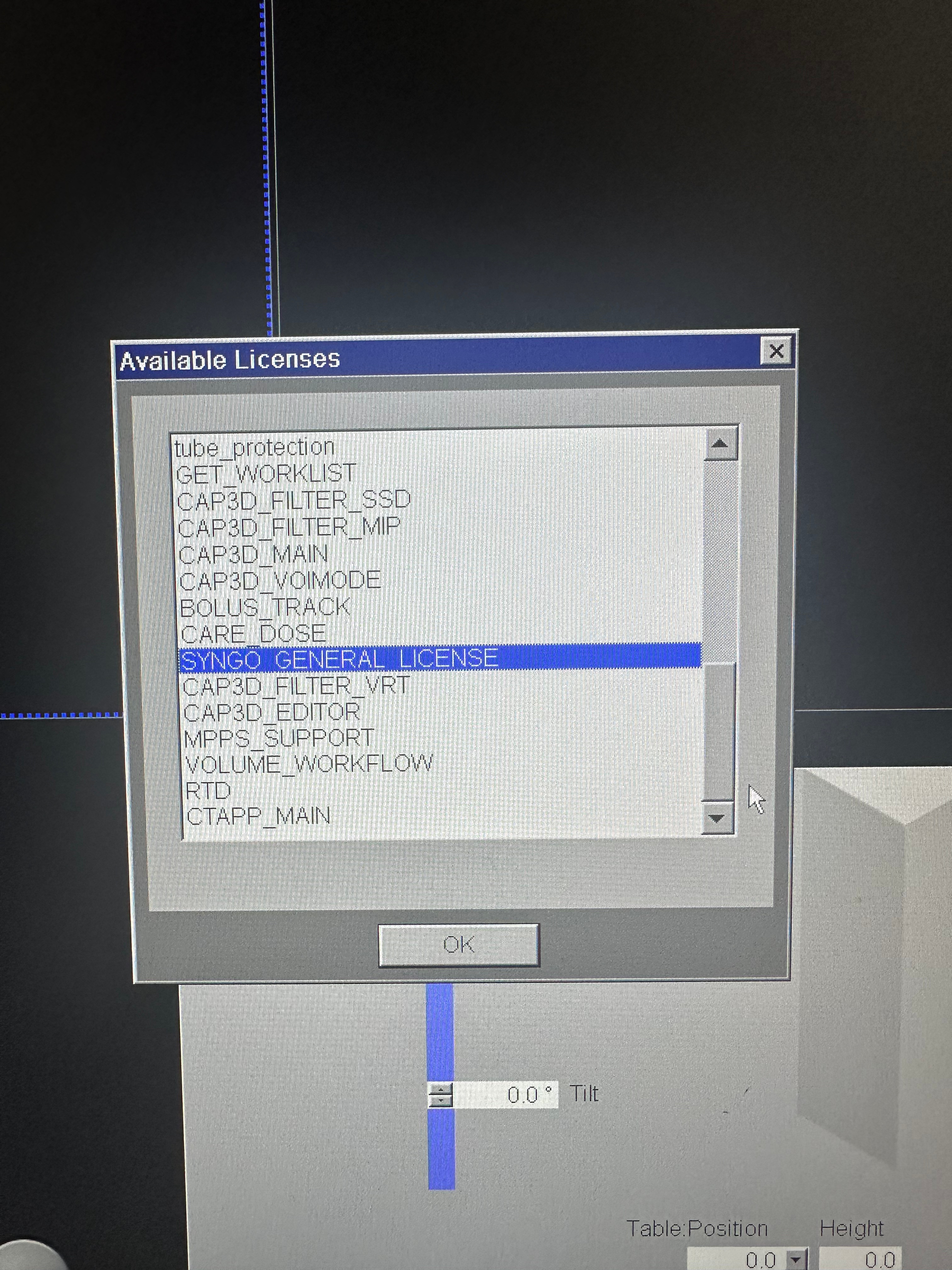CAP3D_BONEREMOVAL, REMOTE_DESKTOP, DICOM_SR_VIEWER, CTAPP_FILTER_VRT, CTAPP_FILTER_MIP, SCAN_AUTOREGION, CARE_DOSE_ADJUST, RECON_INTERACTIVE_STEP1, MR_Support_i, HIGH_SPEED_0.48, HIGH_SPEED_0.6, RECON_PLUS_P68, ECO_MODE, RECON_SLICE_06_MM, RECON_iMAR, FAST_mAs, Context_specific_training, Table_Horizontal_Compensation, Perspective_16, Vascular_048s, RECON_INDICATOR_32, tube_protection, GET_WORKLIST, CAP3D_FILTER_SSD, CAP3D_FILTER_MIP, CAP3D_MAIN, CAP3D_VOIMODE, BOLUS_TRACK, CARE_DOSE, SYNGO_GENERAL_LICENSE, CAP3D_FILTER_VRT, CAP3D_EDITOR, MPPS_SUPPORT, VOLUME_WORKFLOW, RTD, CTAPP_MAIN |